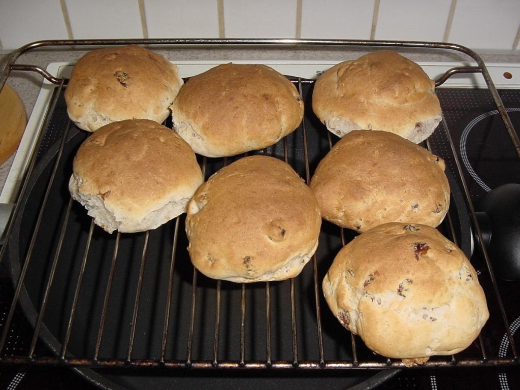 Zet de oven (als de broodjes 2x zo groot zijn) op 180-190 graden en bak ze in ca. 30-40 minuten gaar en lichtbruin.