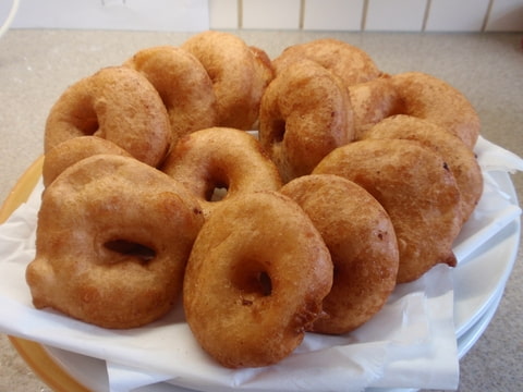 Wentel een appelplak door het beslag en laat die voorzichtig in de olie glijden.