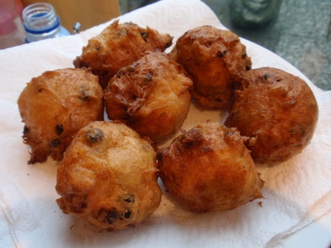 Met een ijslepel (of 2 eetlepels) bolletjes pakken en in de hete zonnebloemolie (zie appelbeignets) 8-10 minuten bakken tot ze mooi bruin zijn.
