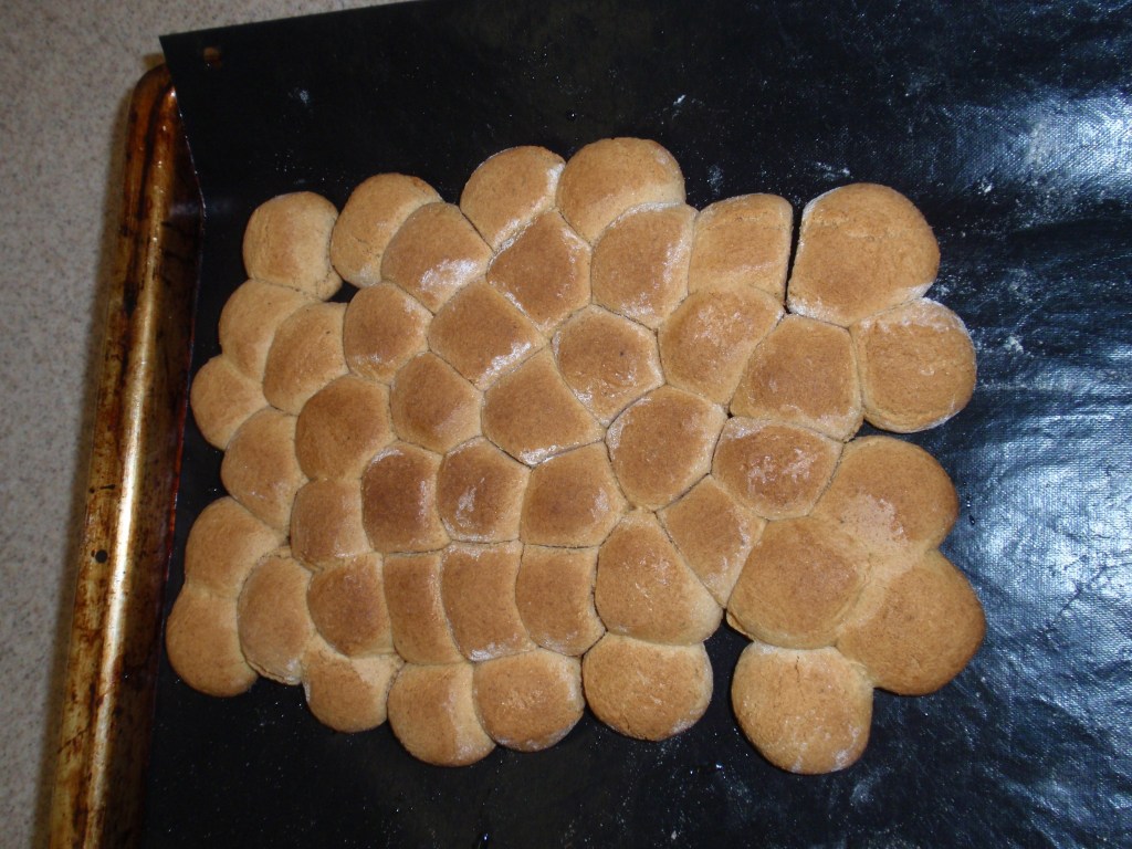 Leg ze met ca. ½ cm. tussenruimte op de bakplaat en bak ze in ongeveer 15 minuten lichtbruin.