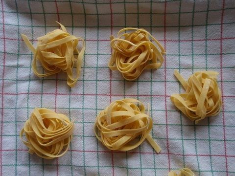 Je kunt de pasta ook drogen, neem 3 à 4 slierten tagliatelle en draai die zeer losjes in een “nestje”, leg ze op een theedoek op bv. een bakplaat en laat ze zo drogen tot ze droog aanvoelen.