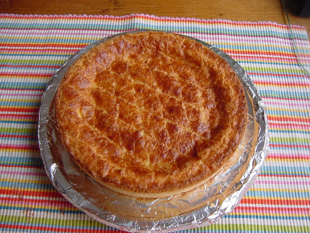 -Rasp een halve appel en verdeel die over het uitgedrukte deeg, bestrooi met een eetlepel (riet)suiker en wat kaneel. Laat de koek nu wel ca. 10 minuten langer bakken.