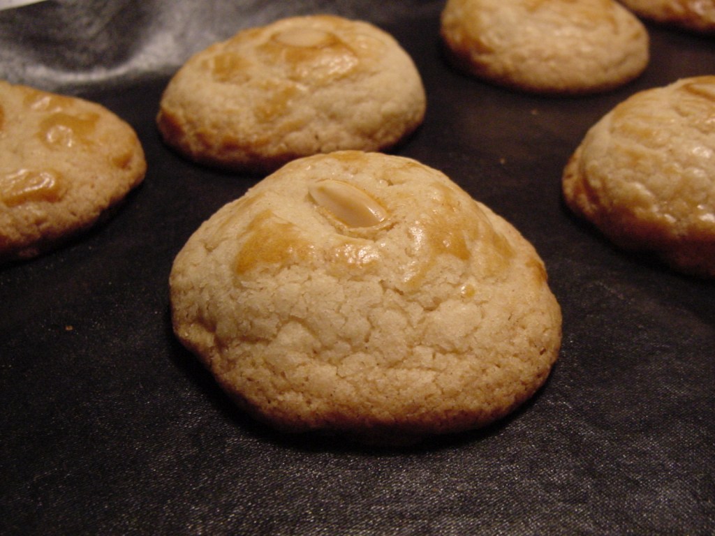 Druk in elke bonbon een halve amandel en bestrijk ze met de rest van het losgeklopte ei.