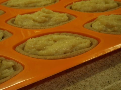 Druk in elk vormpje een deegballetje uit tot de wanden ook met deeg bedekt zijn.
