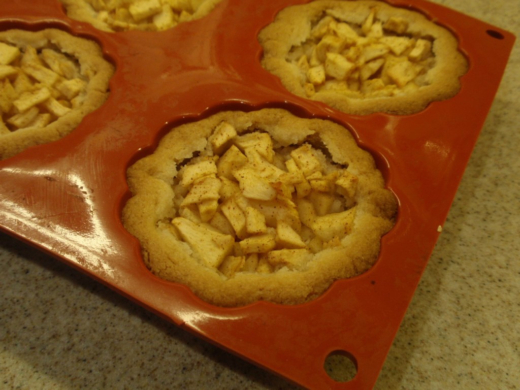 Verdeel de appelstukjes over de vormpjes, laat het bol staan want de appel slinkt bij het bakken.