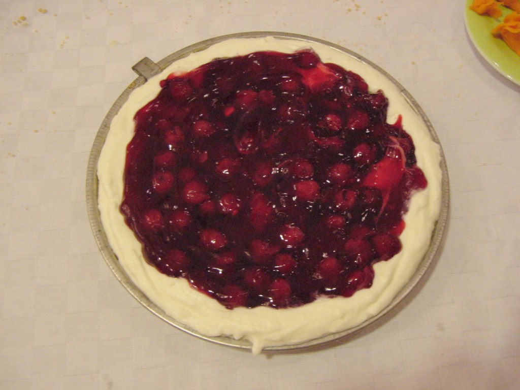 Schep het MonChou mengsel op de gestolde taartbodem en strijk het glad.