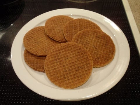Schepje stroop op 1 wafeltje doen en een andere erop leggen, beetje schuiven zodat de stroop verdeeld wordt.